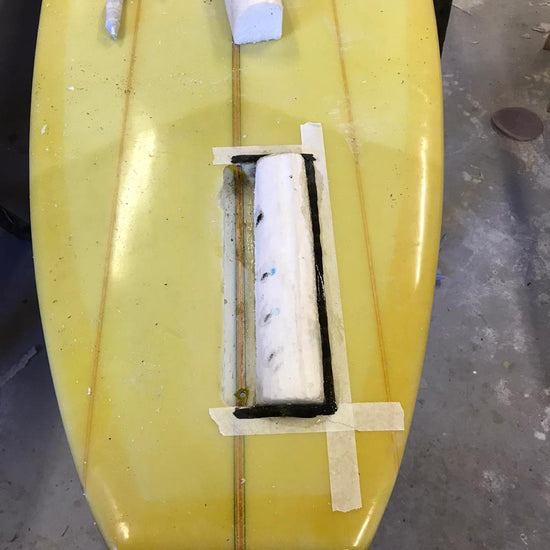 When fin boxes, leash plugs, handles or other inserts crack, it’s important to get them repaired as soon as possible. A damaged fitting allows water to enter the board, making it heavier and gradually damaging the foam core. Water can also travel under the fibreglass skin, causing delamination and much bigger issues later. Sometimes these fittings break cleanly, but other times they tear foam out around the box or plug, meaning the structure needs to be rebuilt properly. We always cut the area back cleanly, remove any damaged foam and cracked glass, and rebuild the core so the new insert has a solid base. Once the box or plug is set with the correct resin mix and alignment, we laminate over the area to lock it in structurally, then sand, colour-match and finish to your specification. Painted boards may need a spray coat, which can add time. Because this work involves multiple stages and curing times, these repairs can sometimes take longer, but the result is stronger, lighter, and built to last